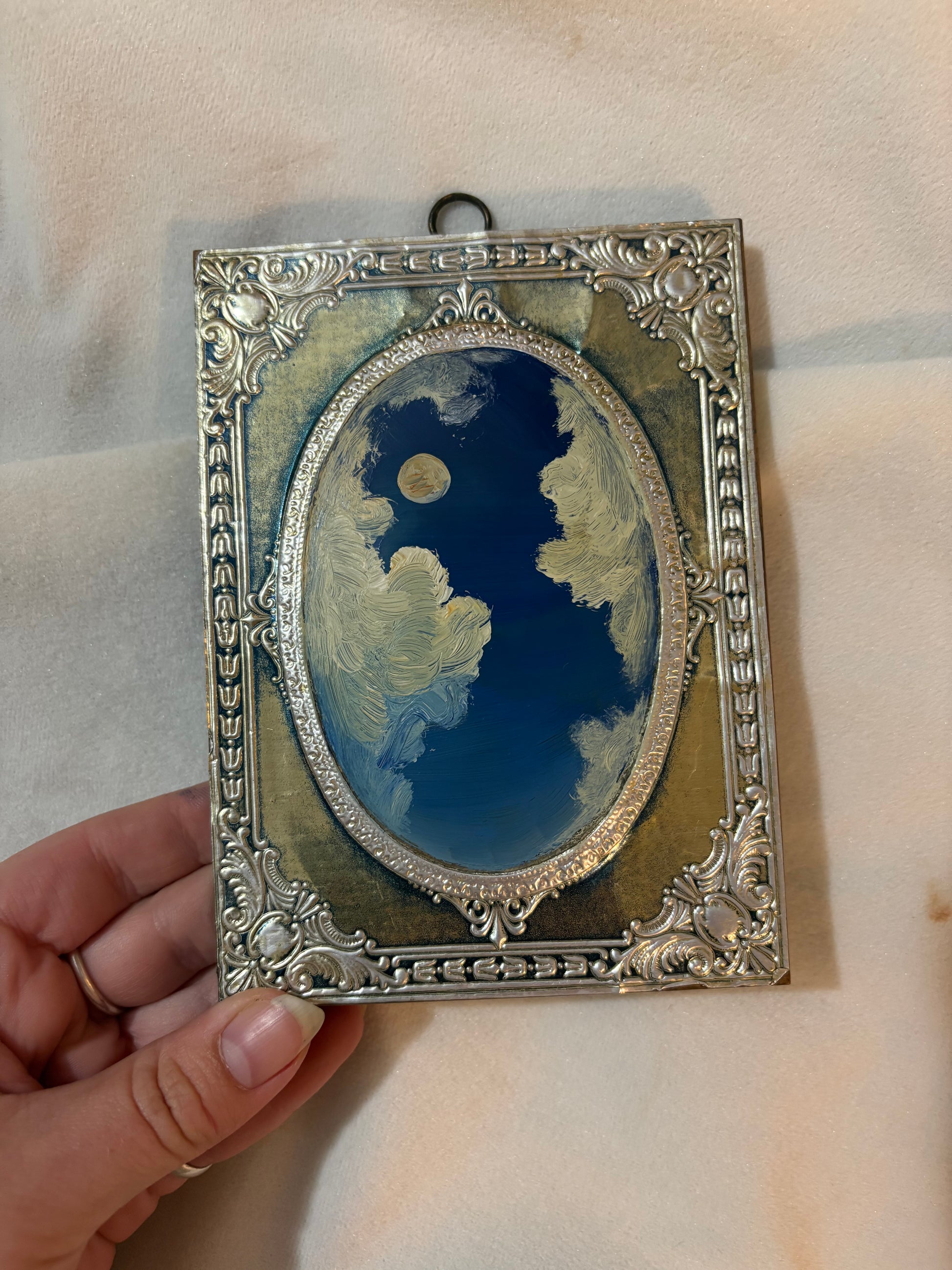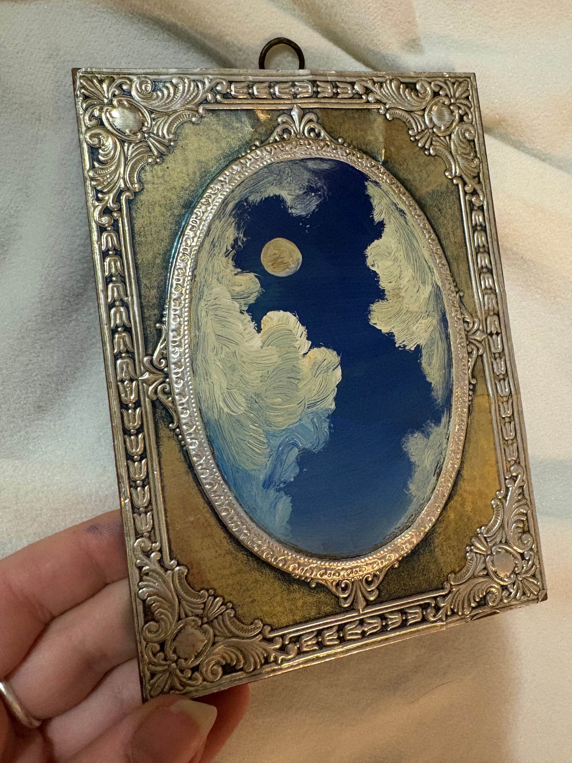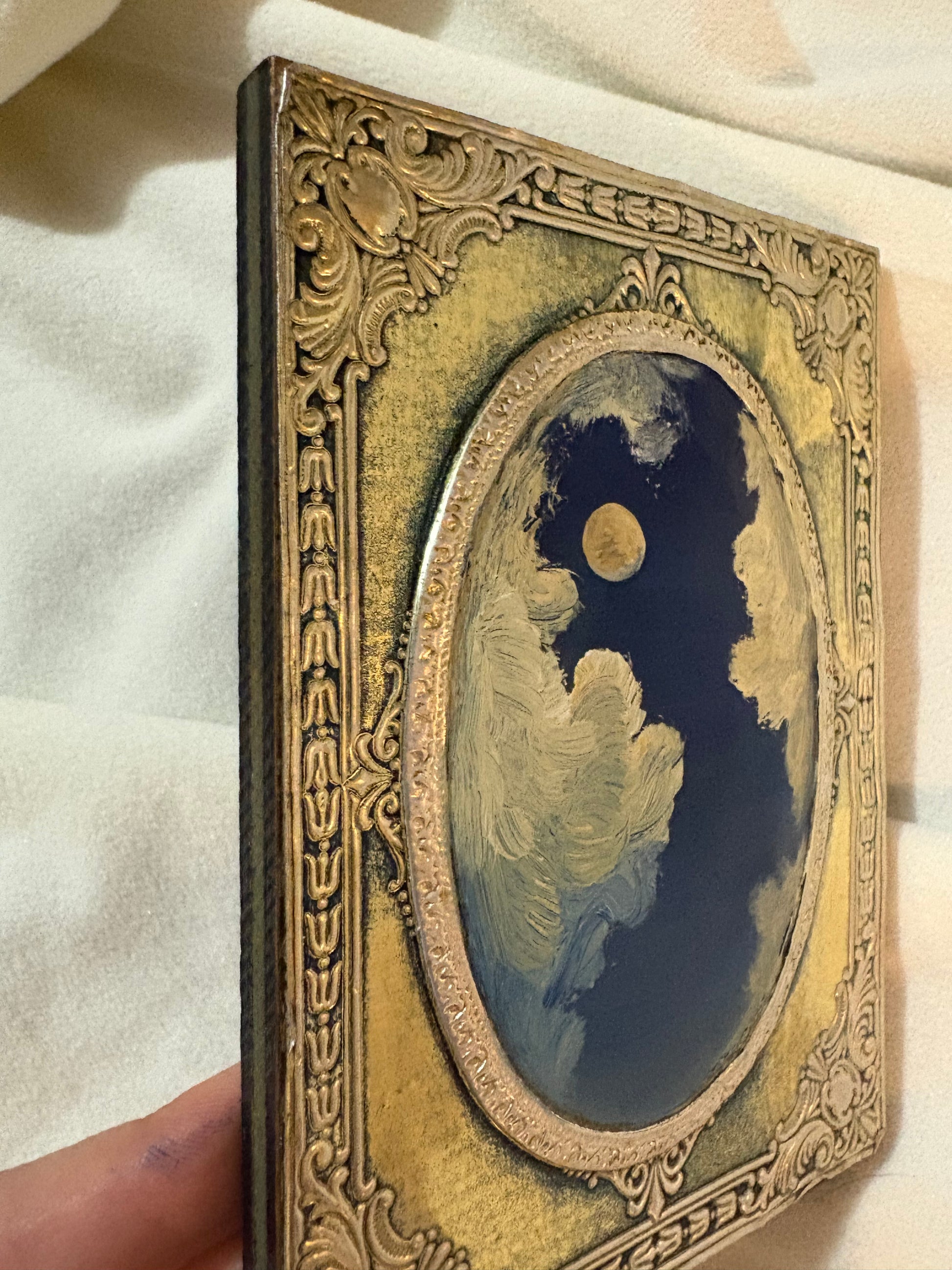 Miniature acrylic painting in vintage embossed metal frame (wood and metal). Antique.