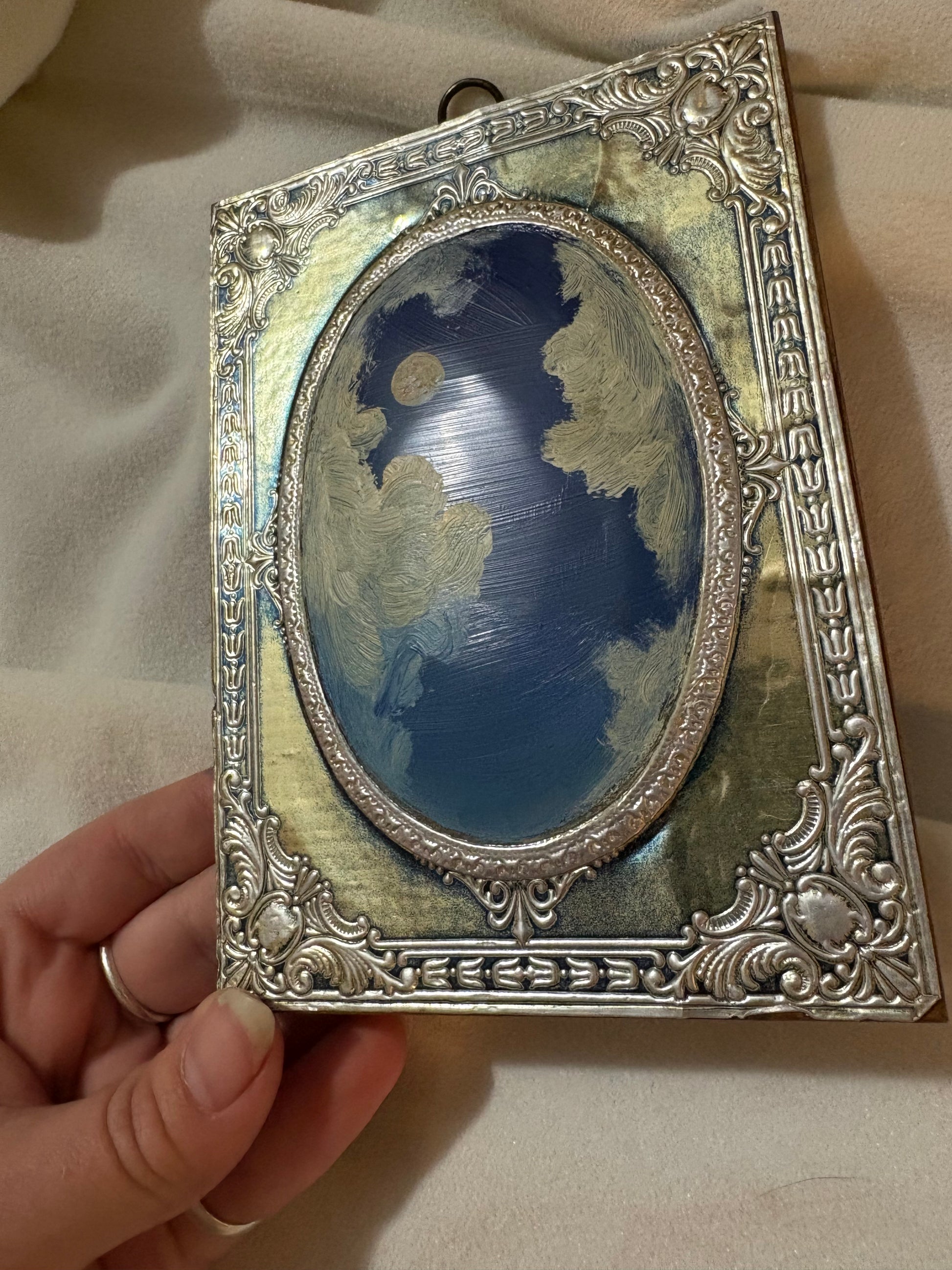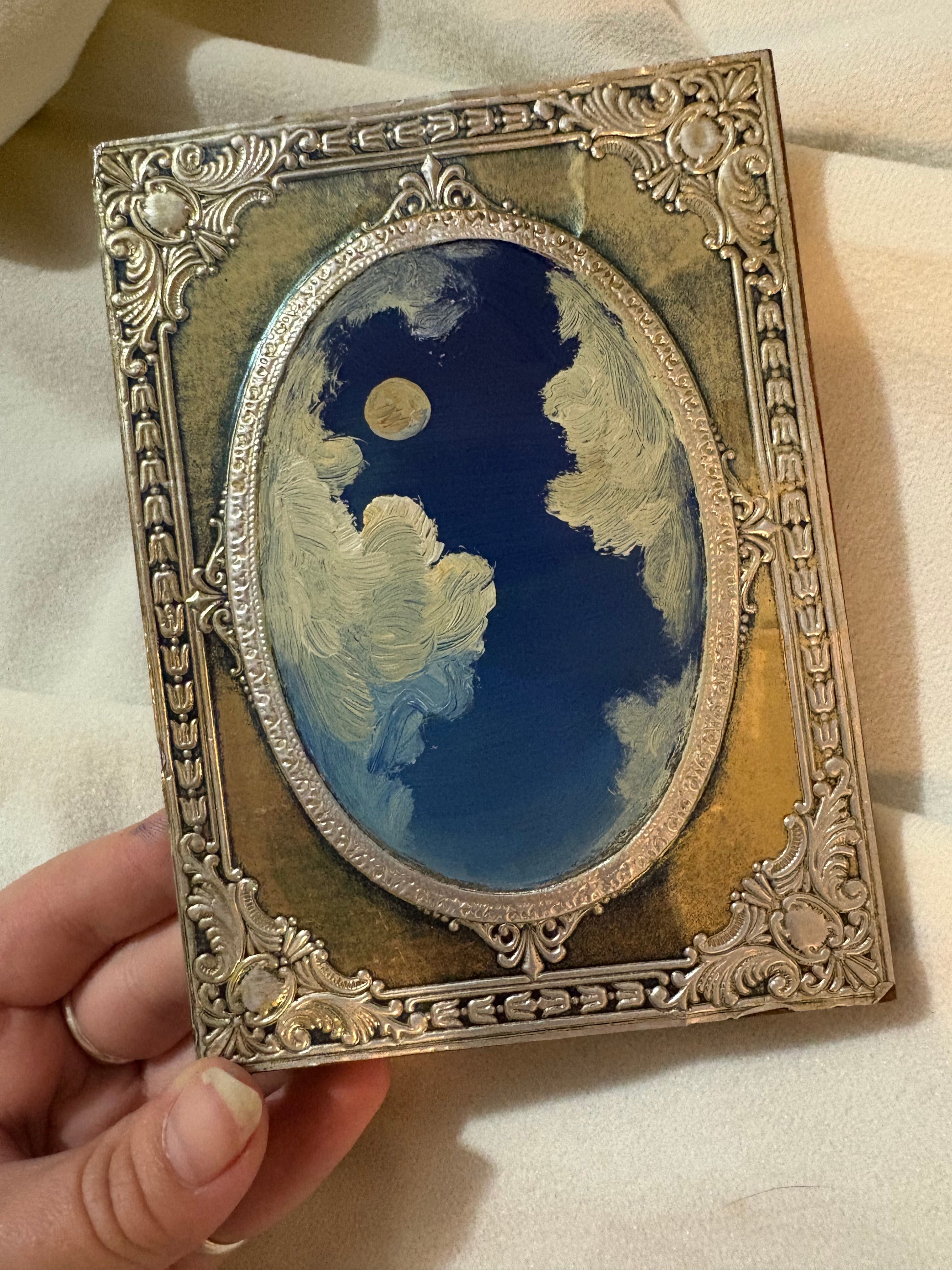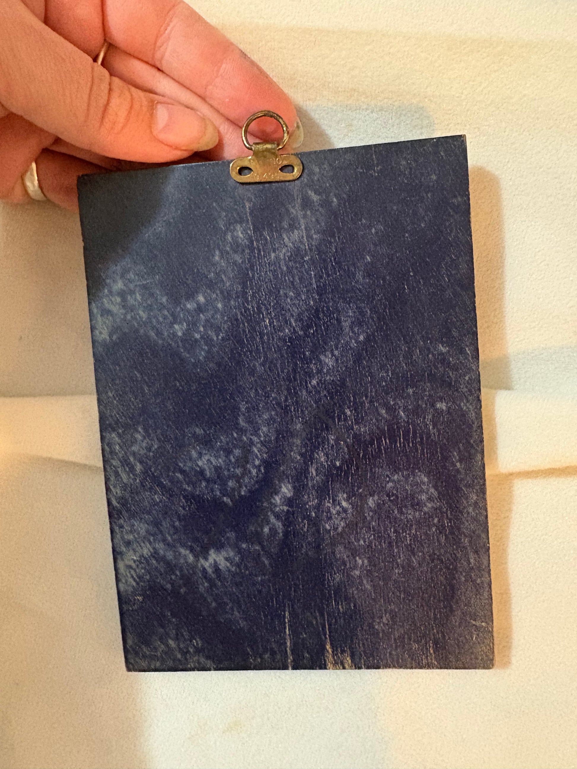 Miniature acrylic painting in vintage embossed metal frame (wood and metal). Antique.