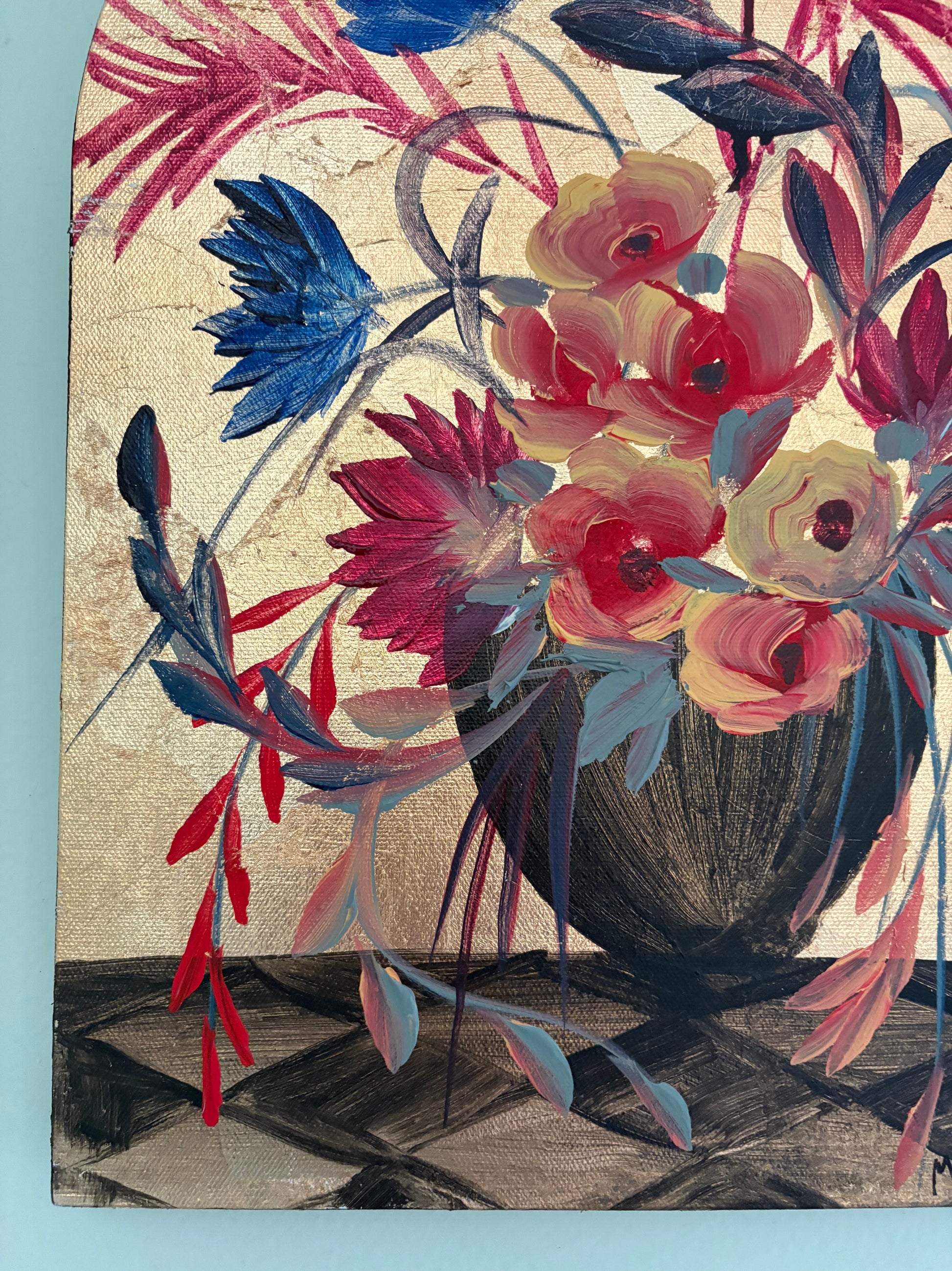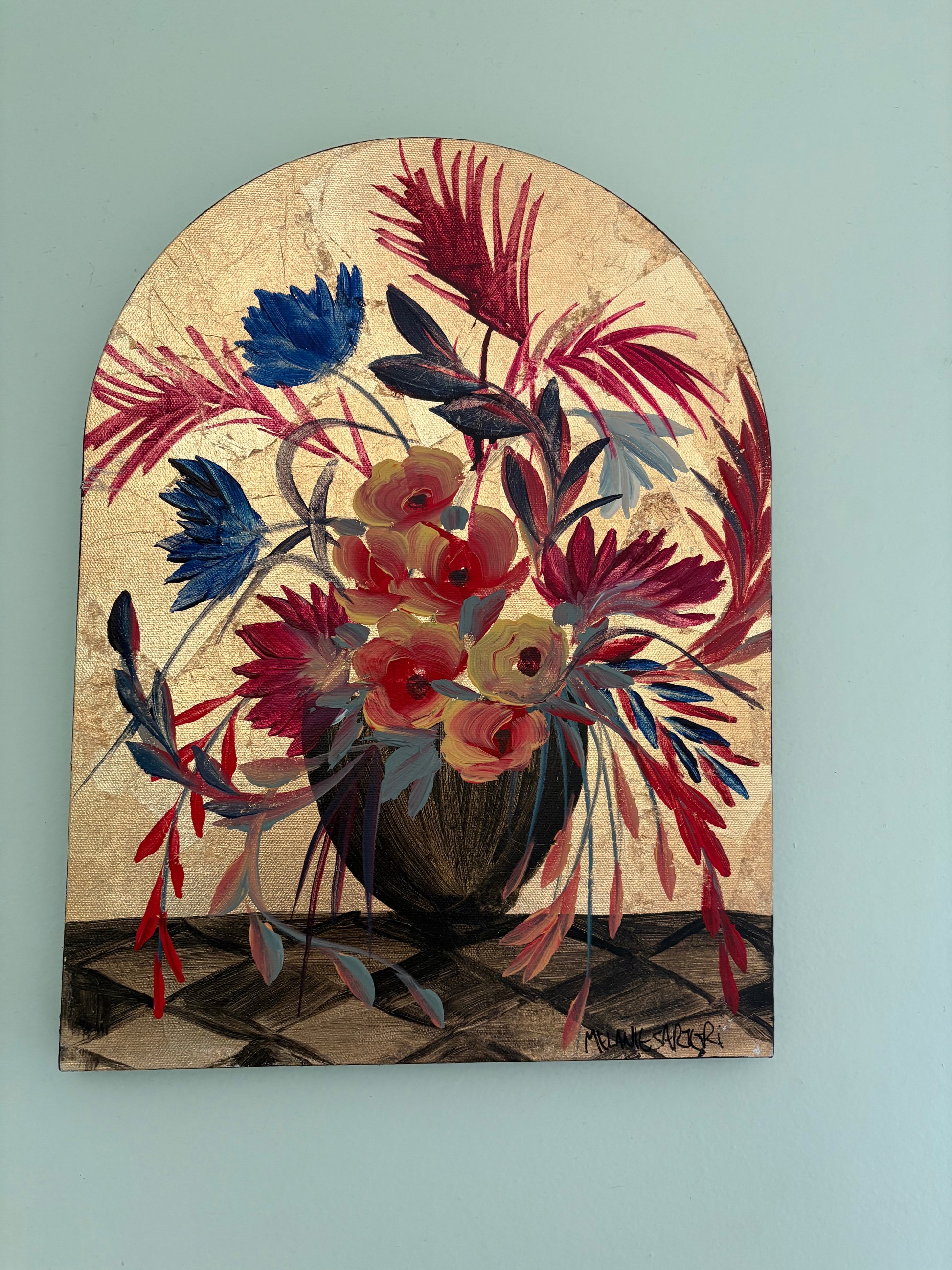 Approx. 11x14 in. Original acrylic painting on gold metal leafed canvas. Wire attached in back.
