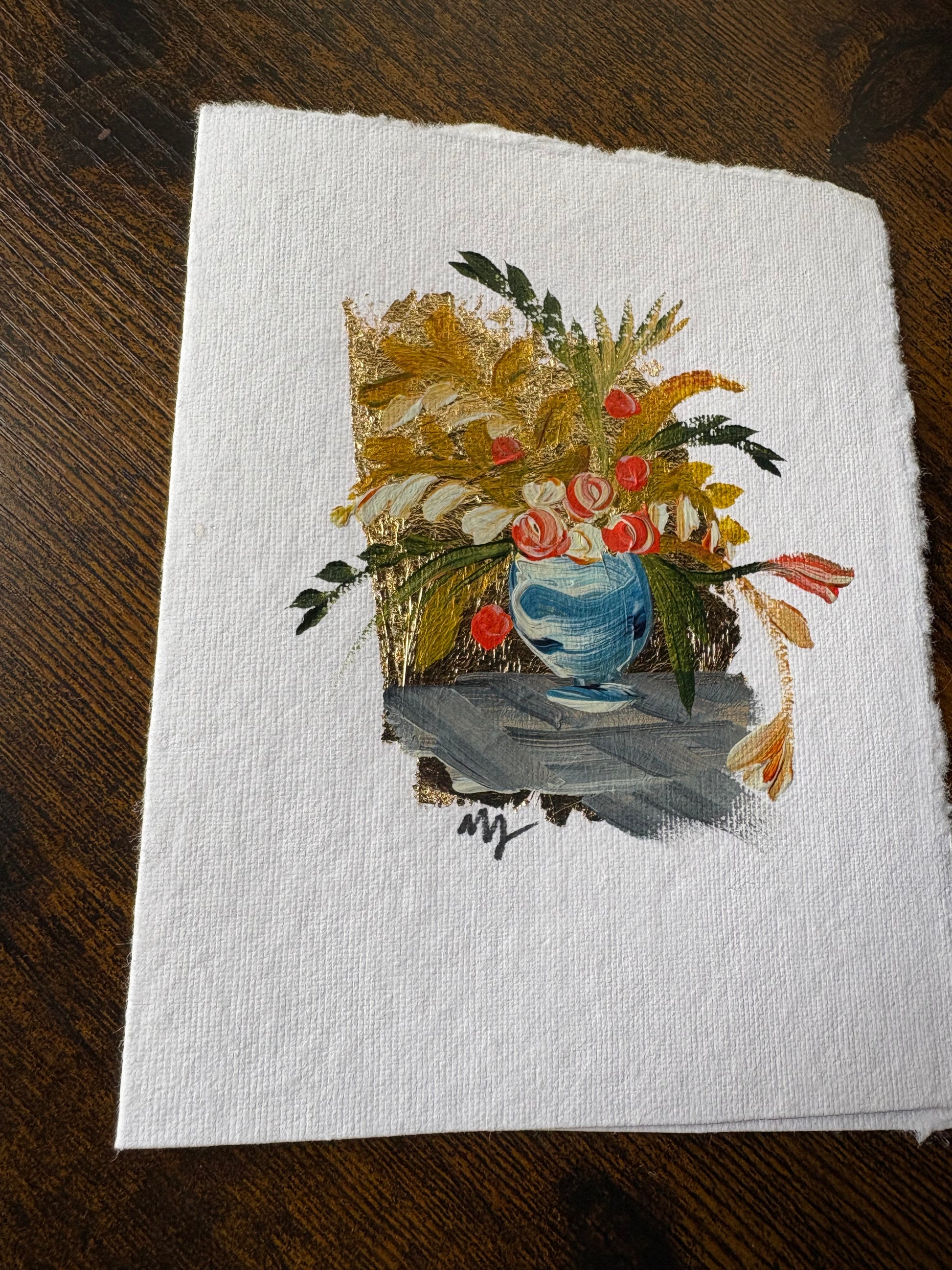 Miniature painting on gold leafed handmade cotton paper. Approx 5x7 in (this one is more like 5x6).