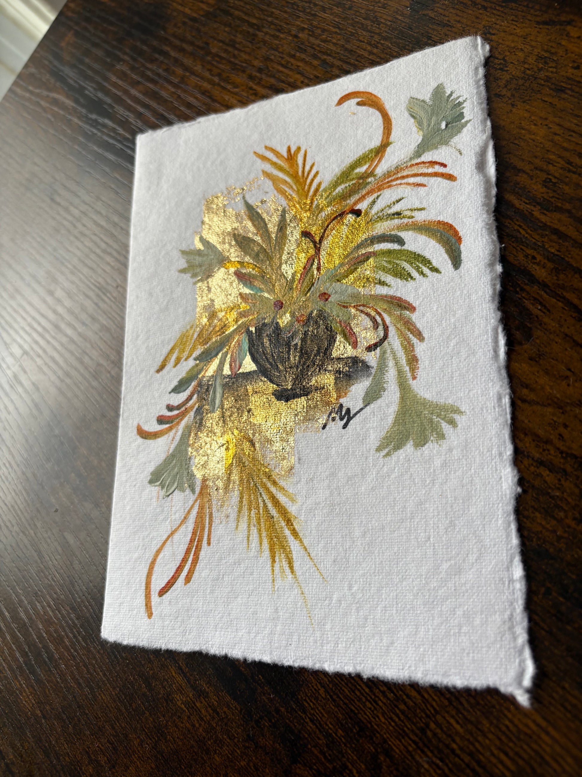 Miniature painting on gold leafed handmade cotton paper. Approx 5x7 in