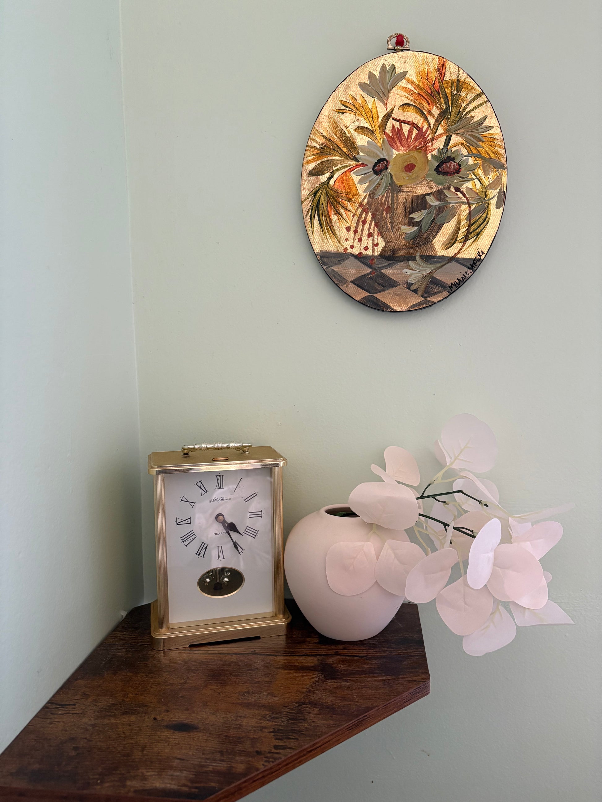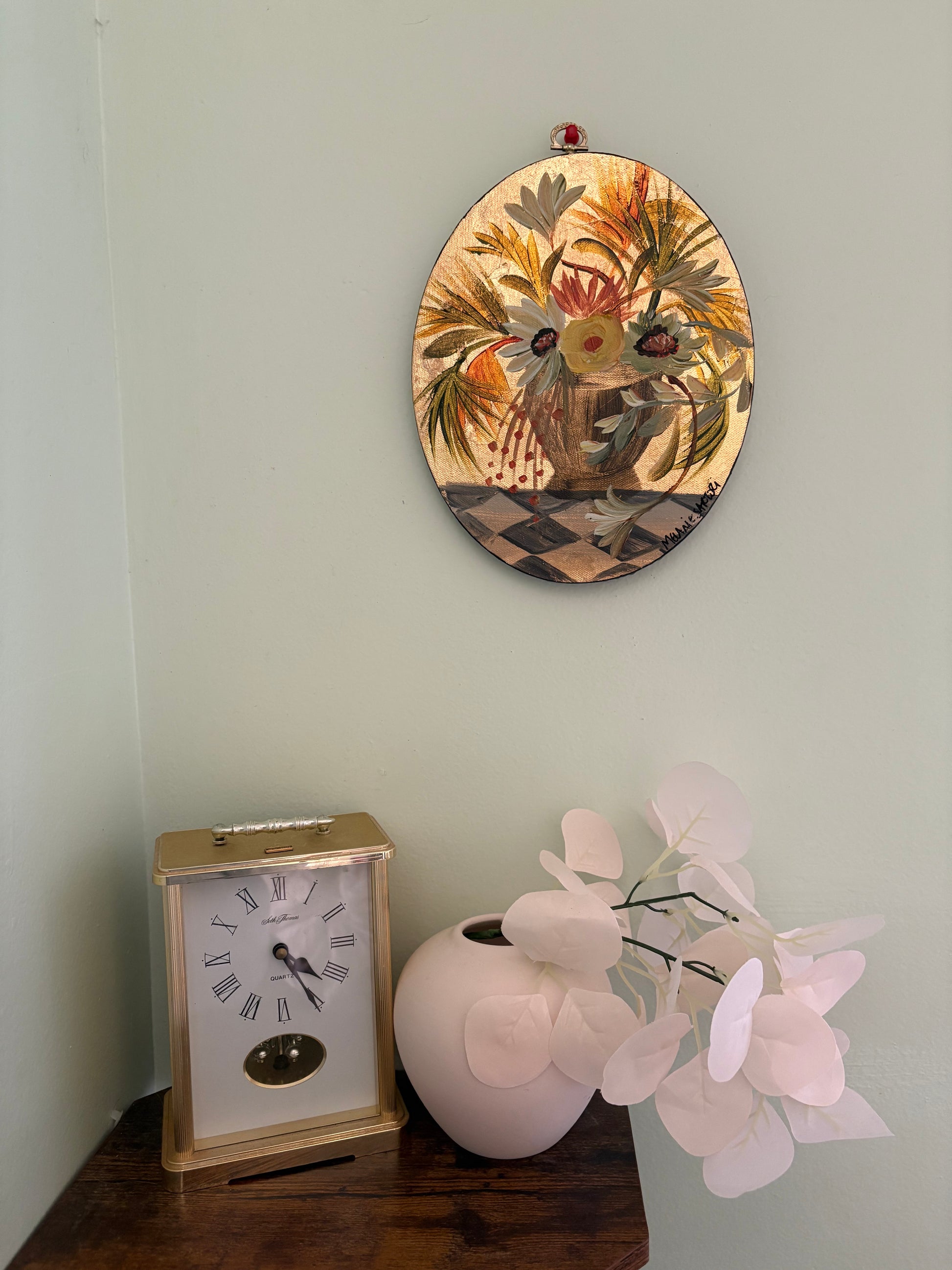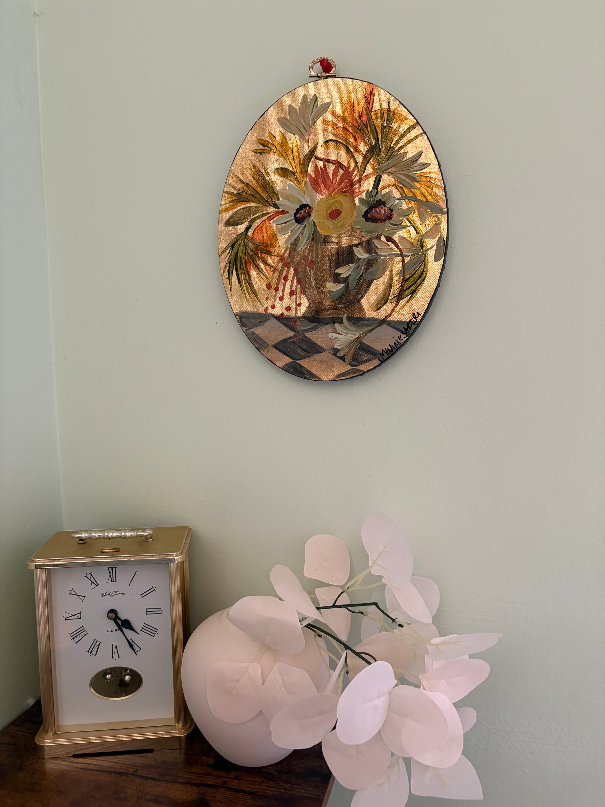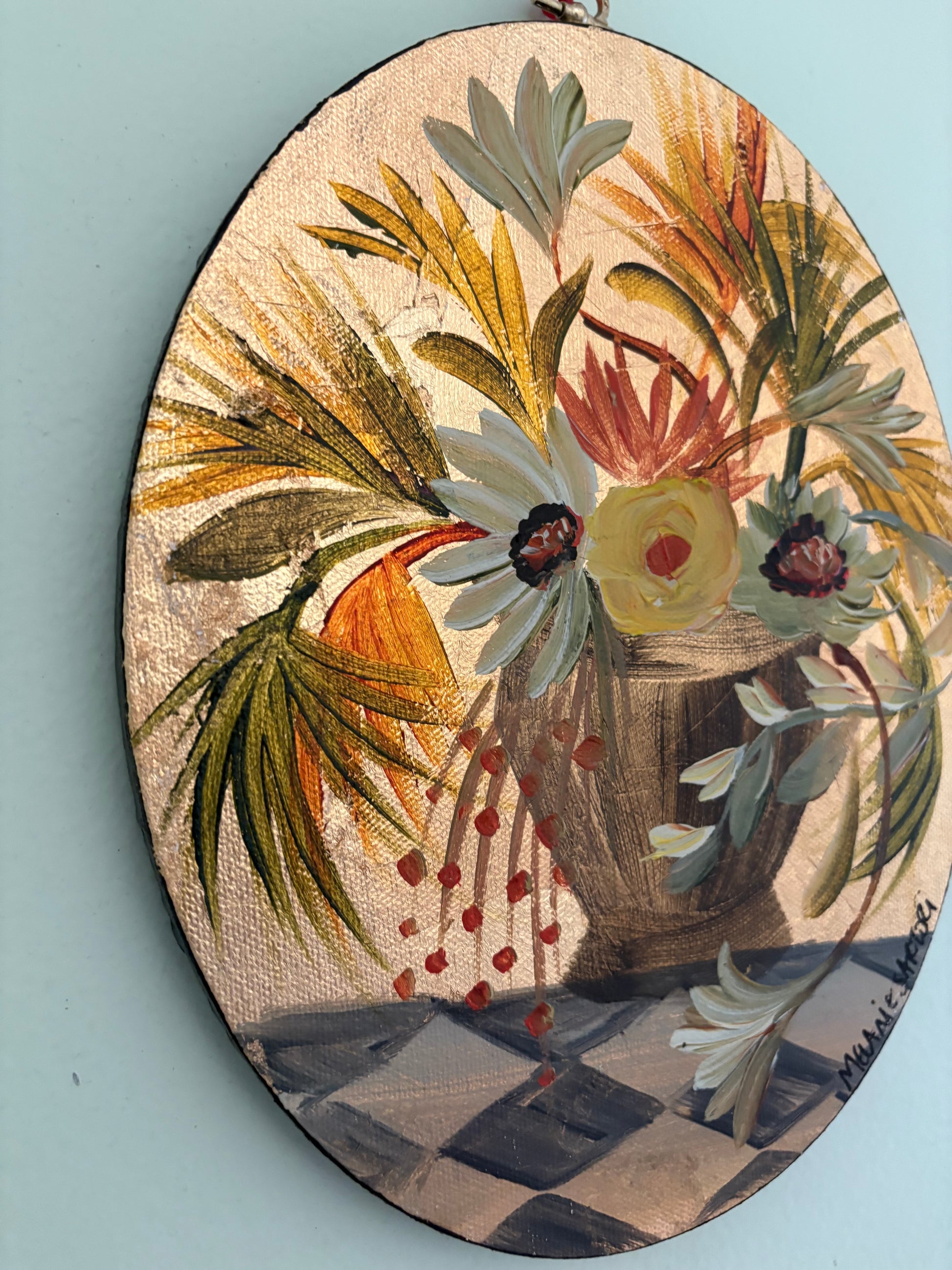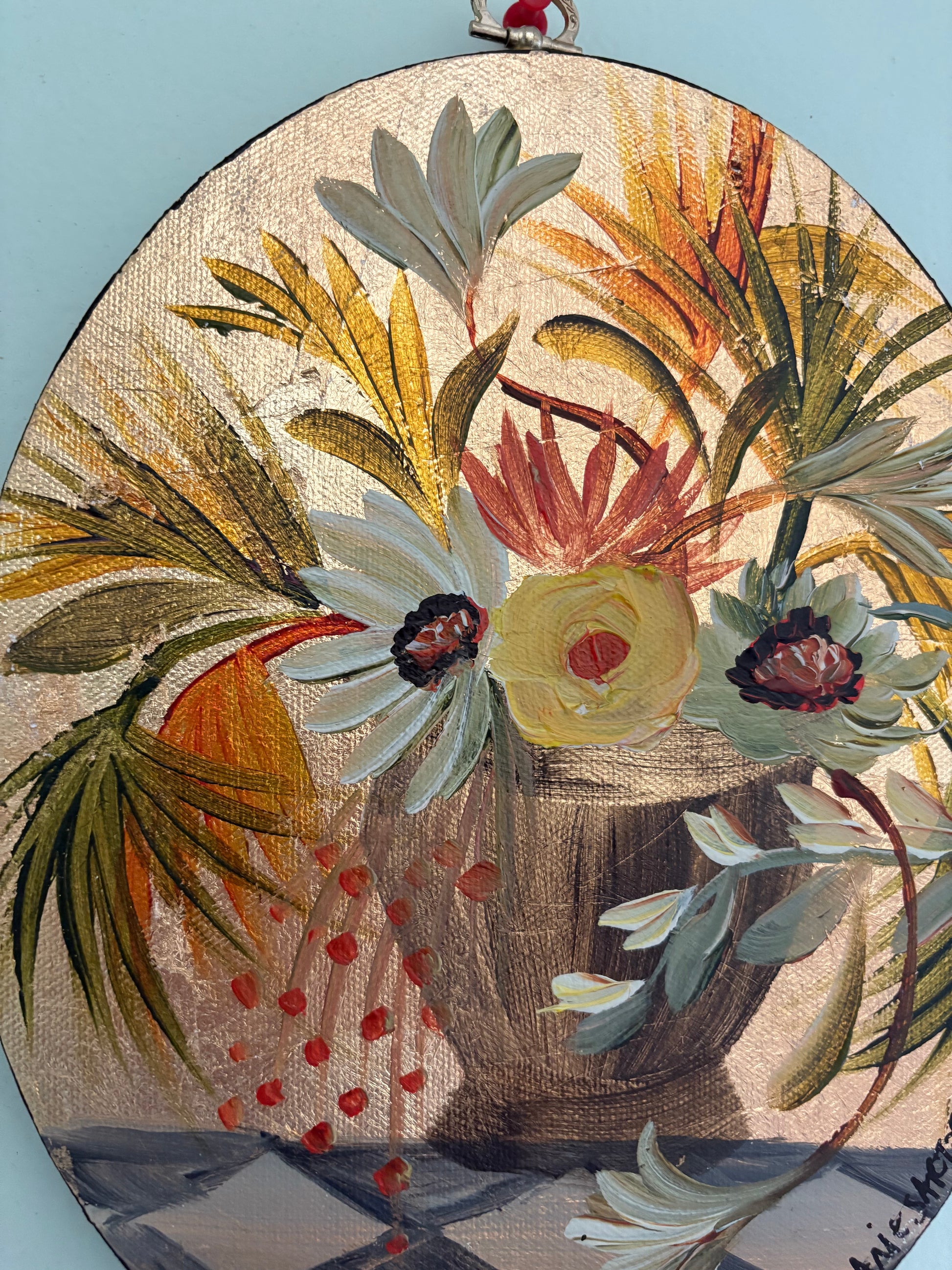 Original painting on oval canvas. Acrylic on gold metal leafed canvas. Vintage hardware on top.