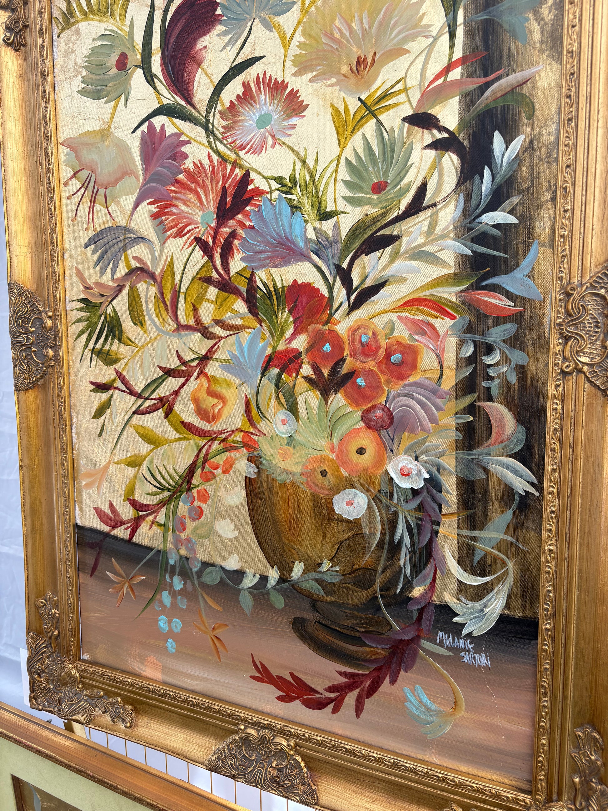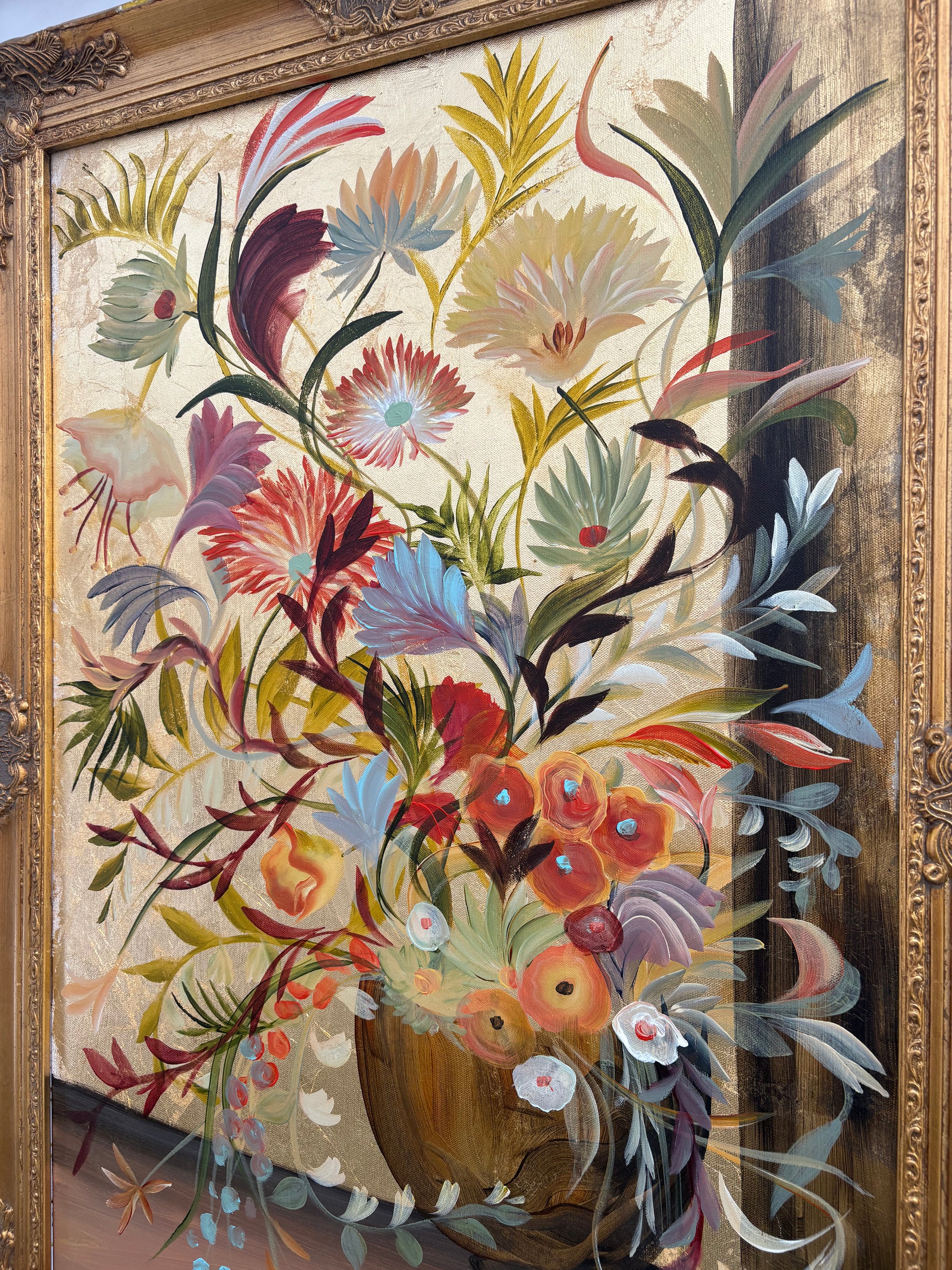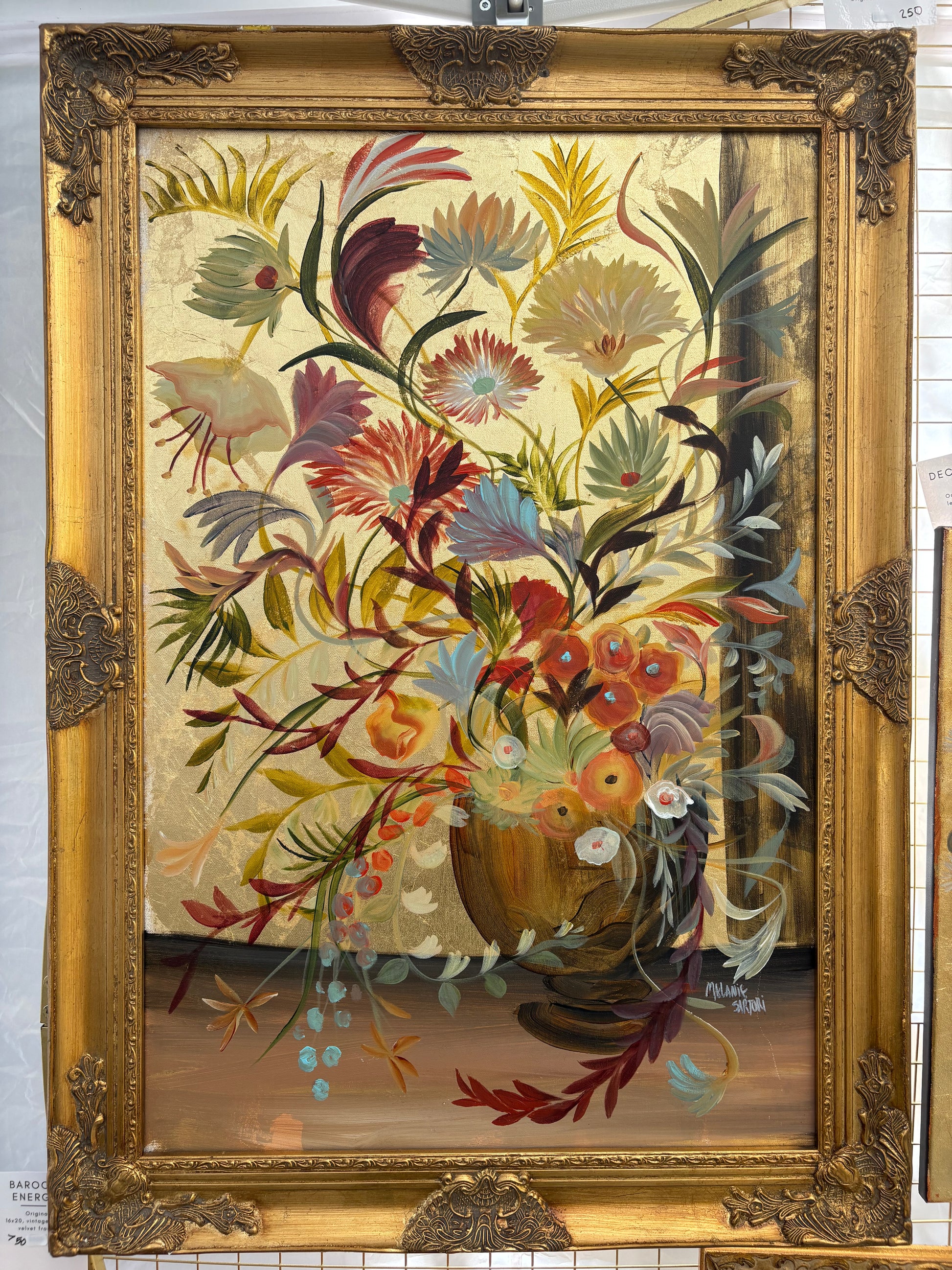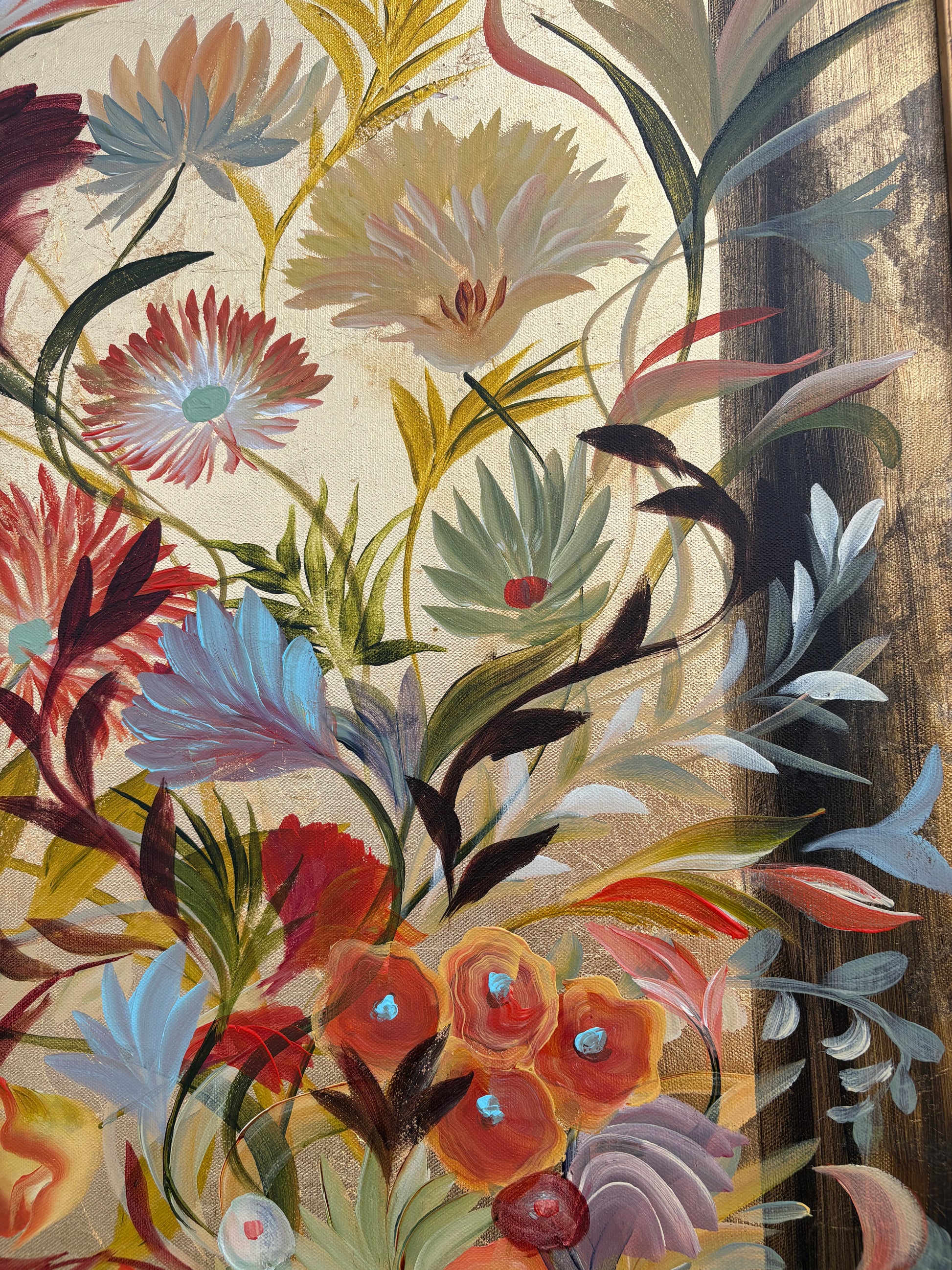Original painting on gold leafed canvas. 24x36. Framed, frame adds approx 2.5 in on each side.