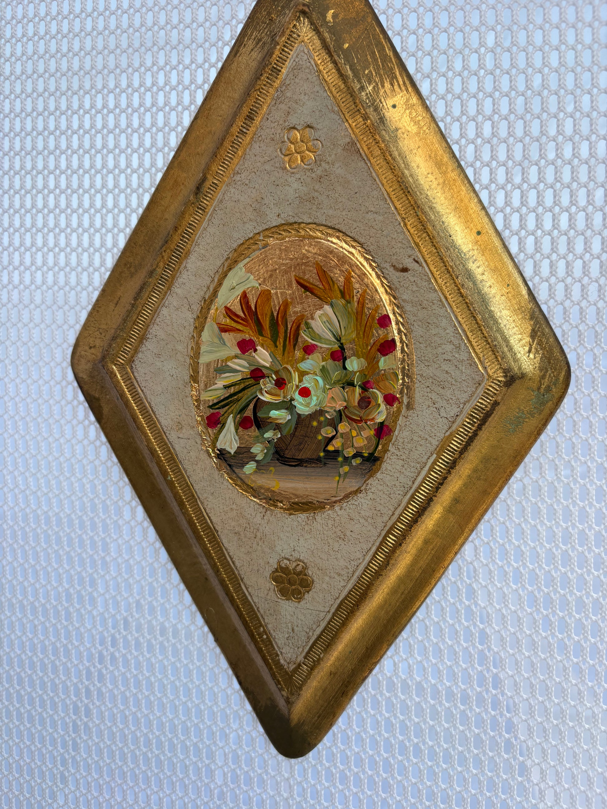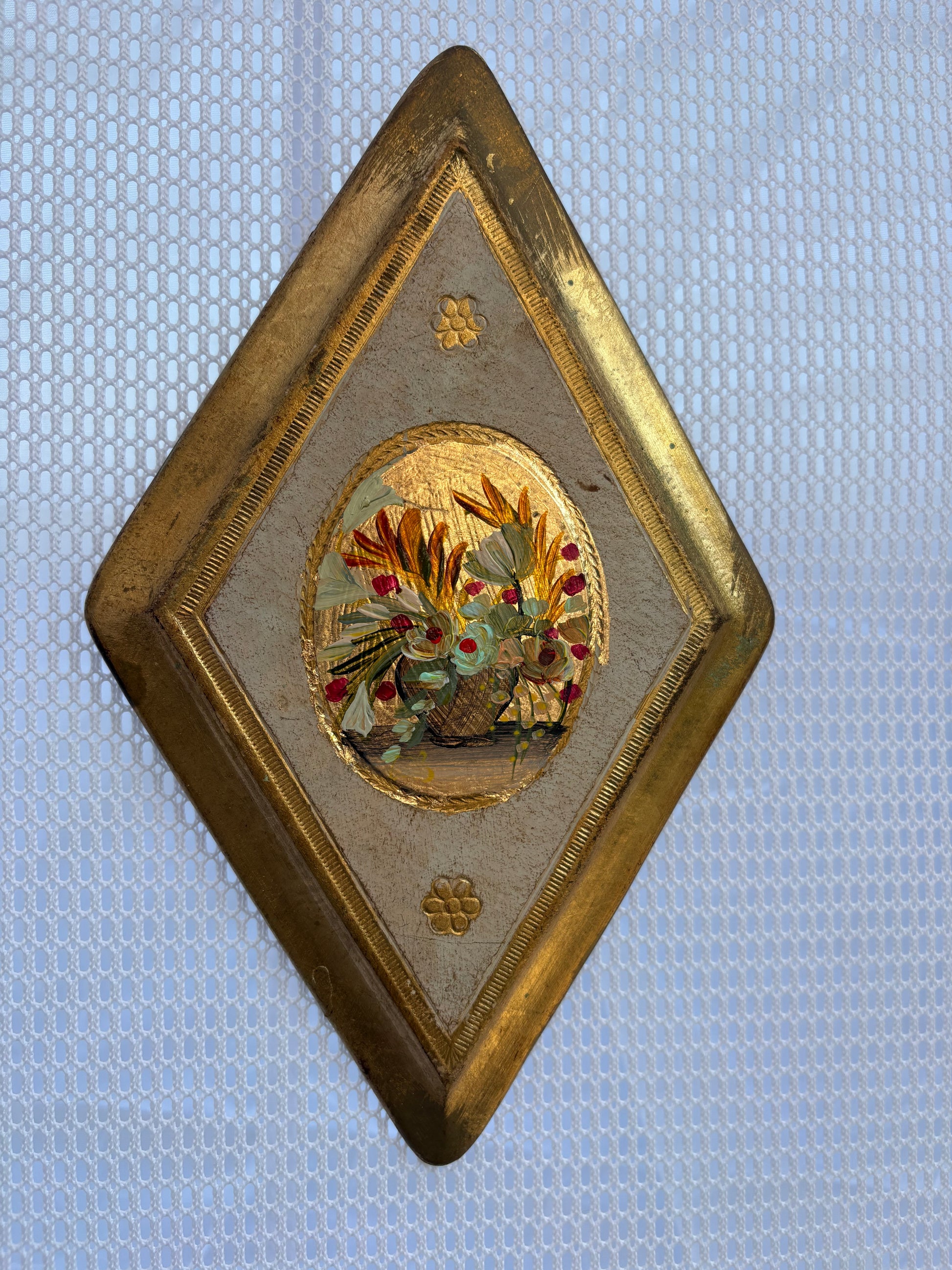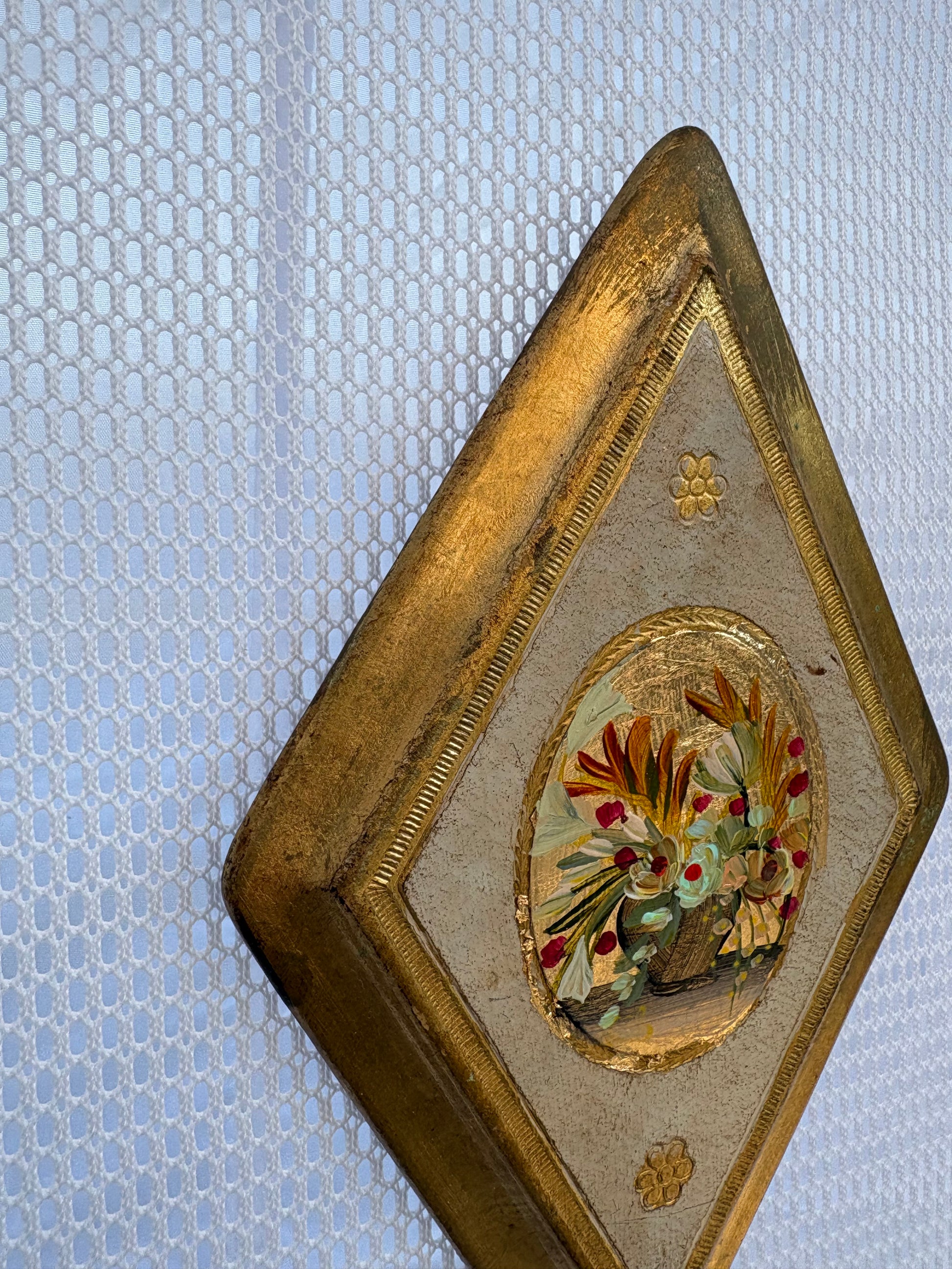 Original miniature painting on gold leafed vintage Italian wood plaque. Approx 6 inches long. Original hook is on back.