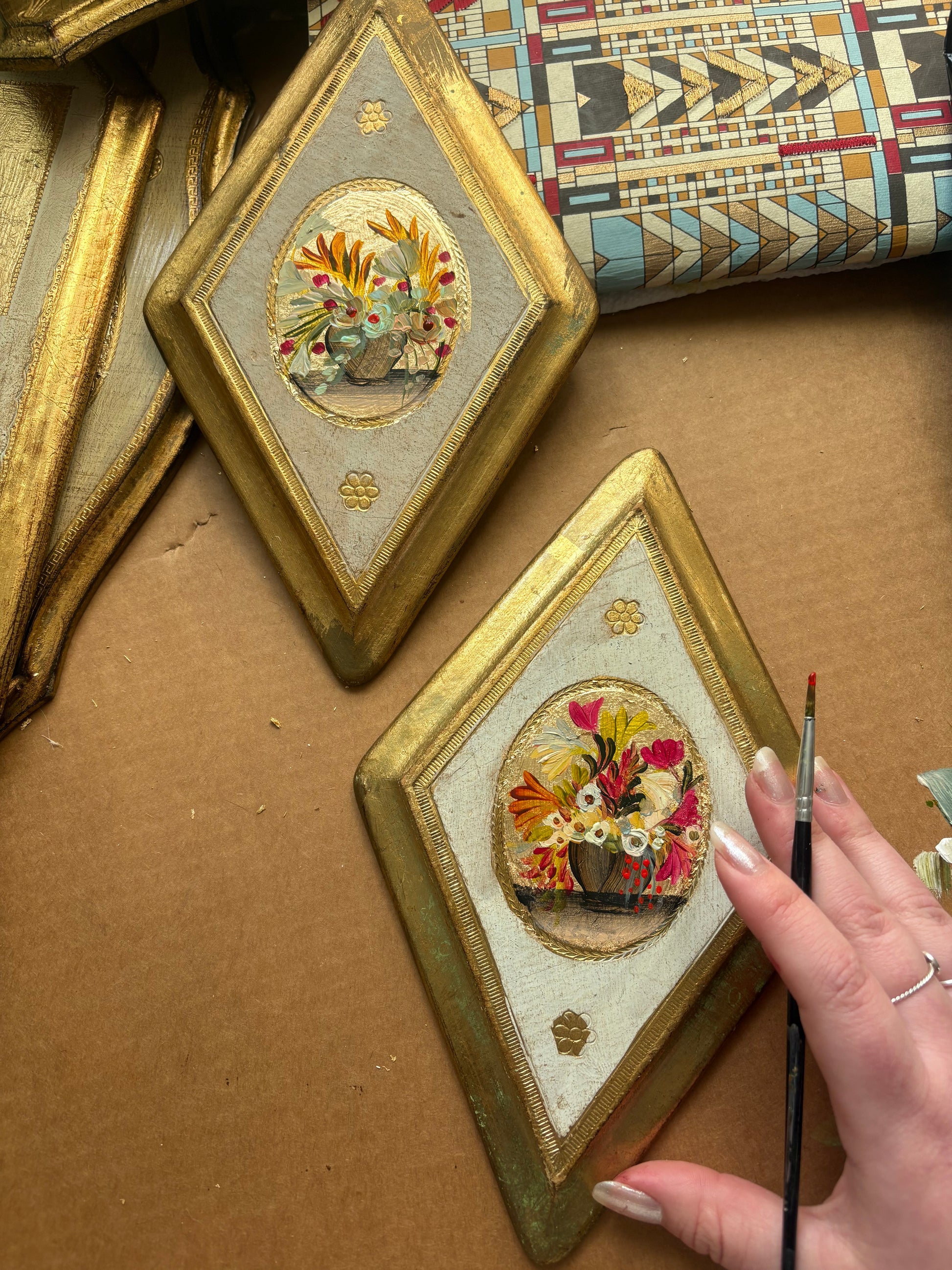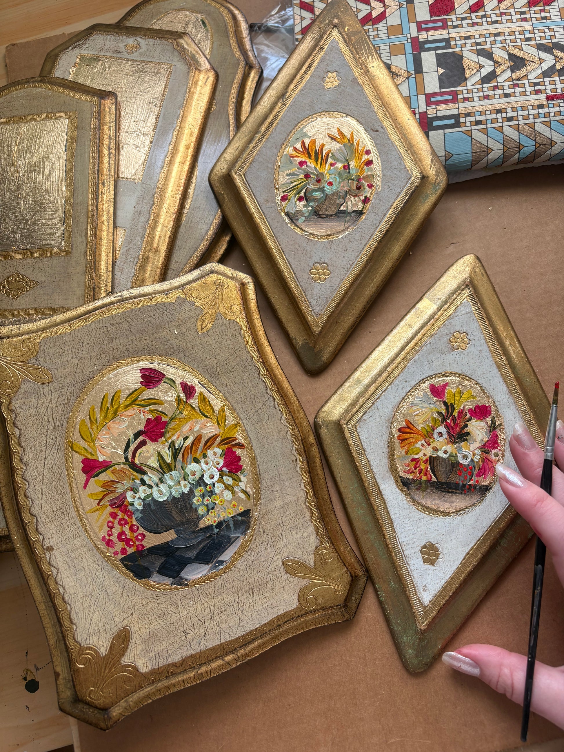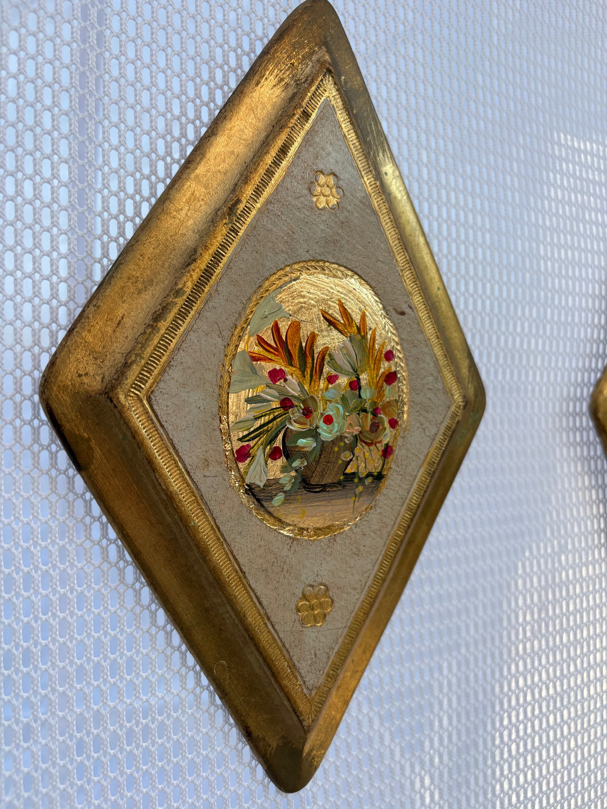 Original miniature painting on gold leafed vintage Italian wood plaque. Approx 6 inches long. Original hook is on back.
