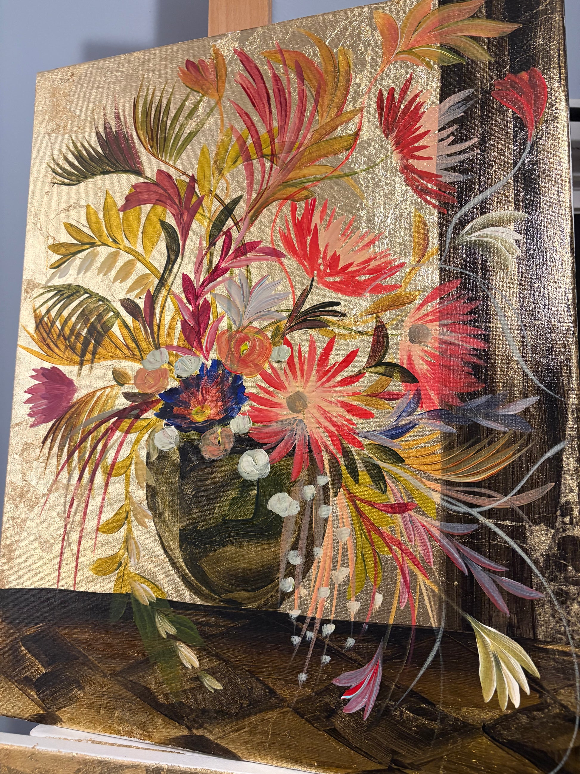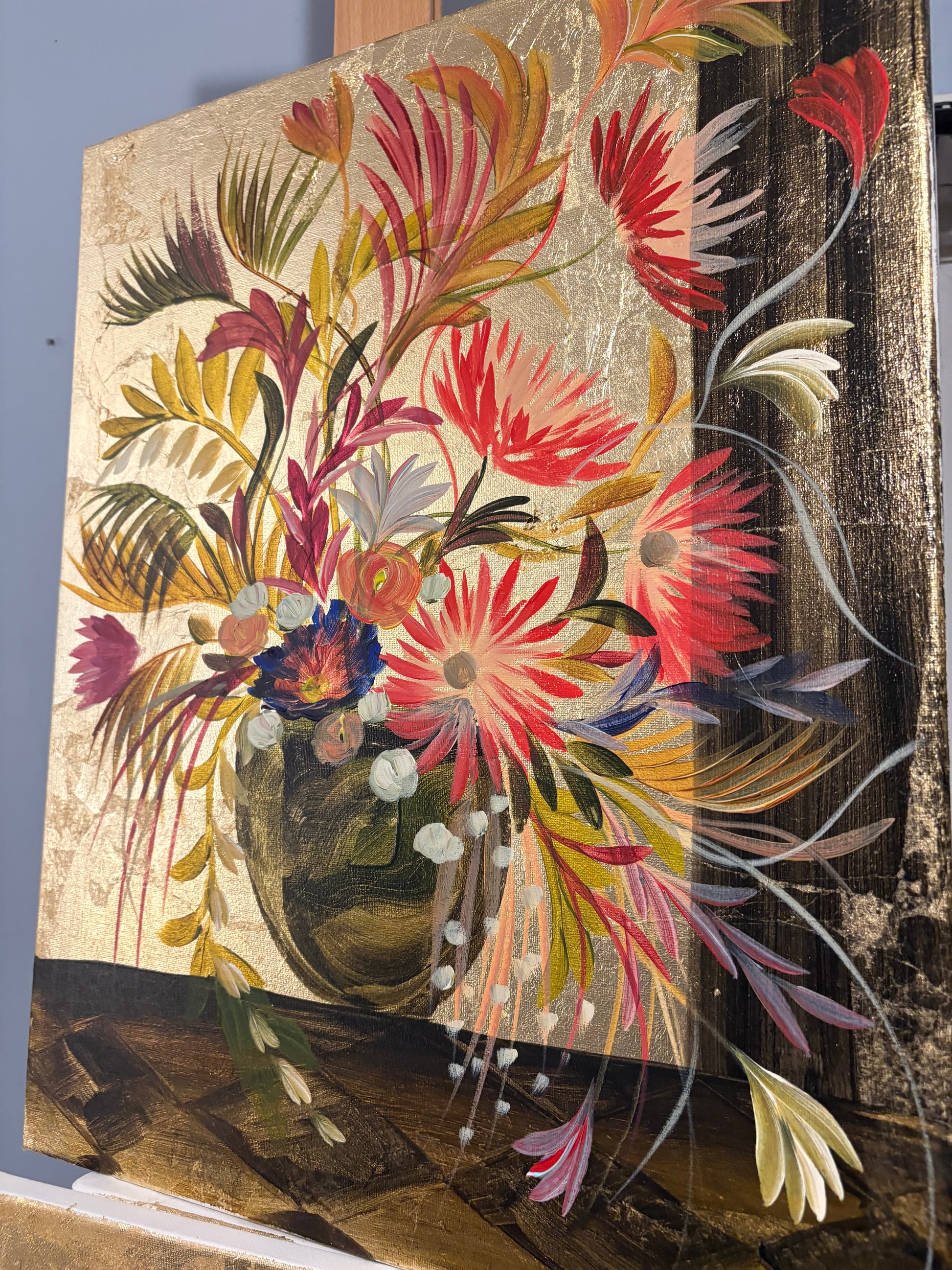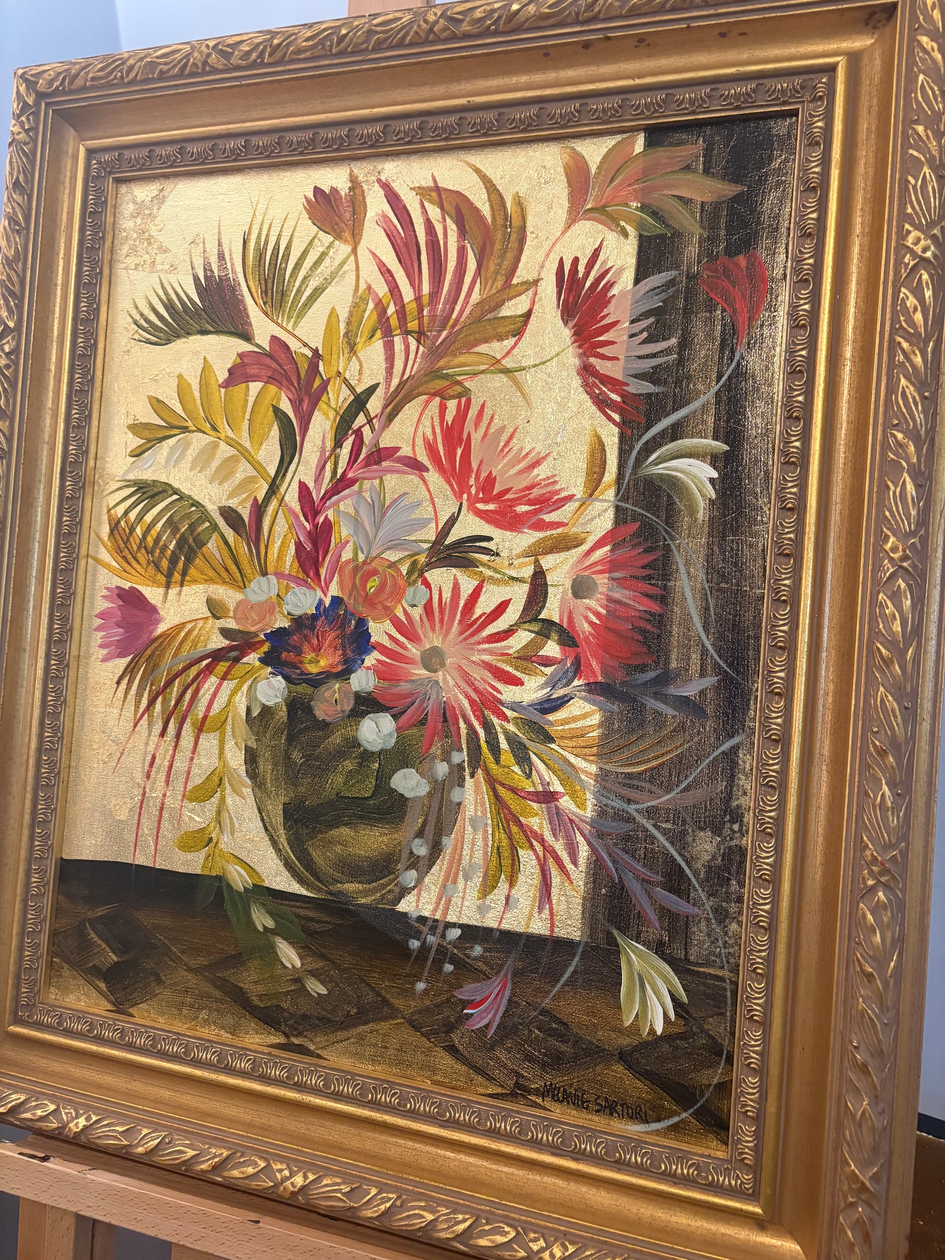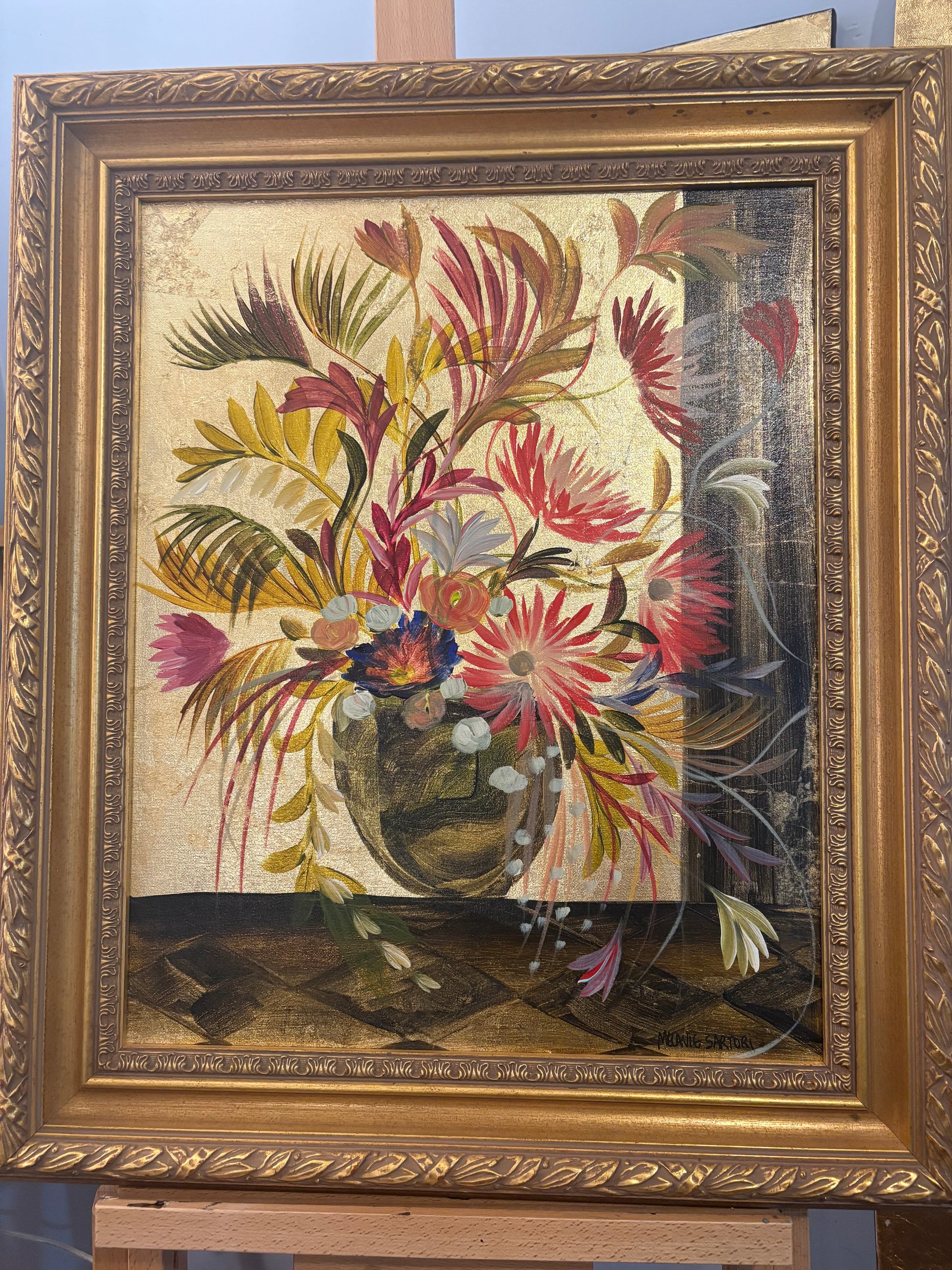 Original painting on 16x20 canvas - acrylic and mediums on gold metal leafed canvas. Framed. Frame adds about 3 inches to each side. True vintage solid wood frame, gilded, circa 1970s. Hanging wire attached to frame.