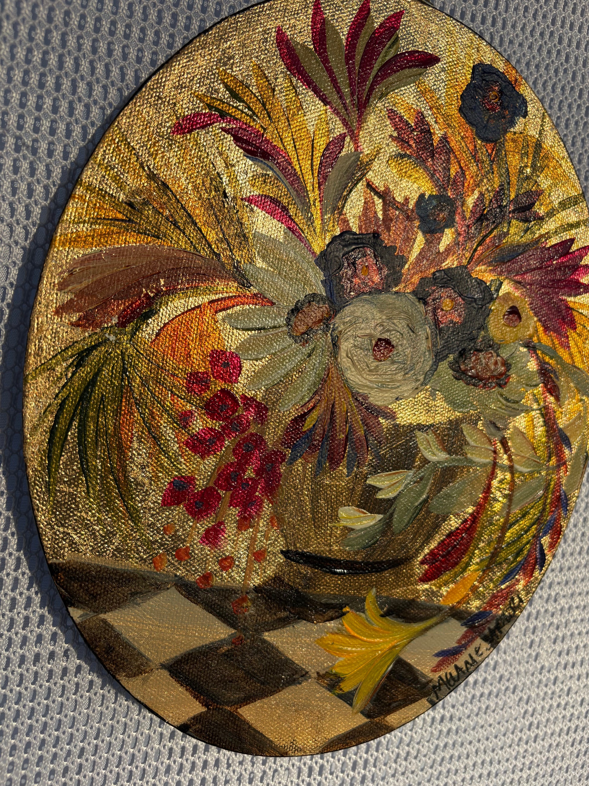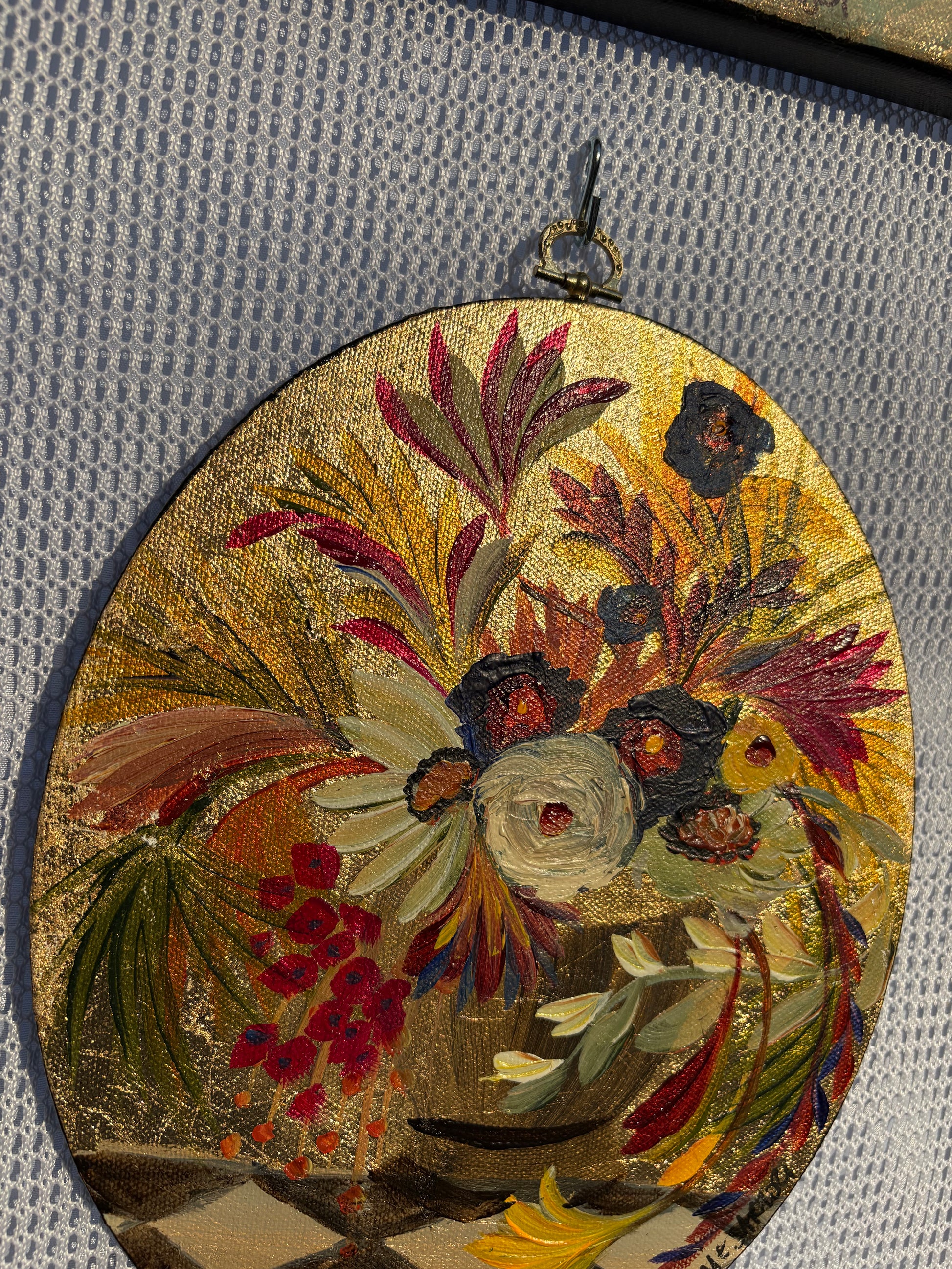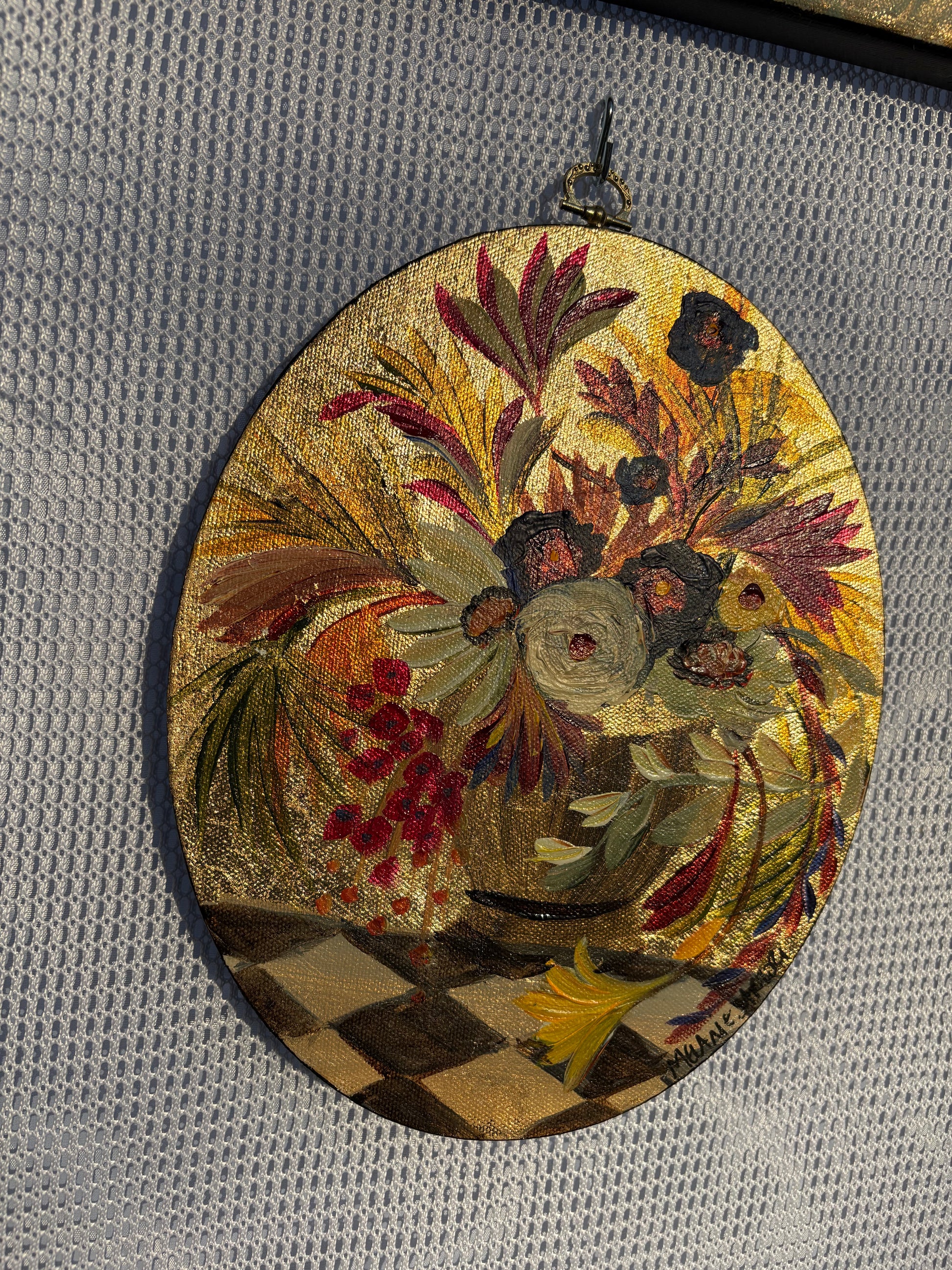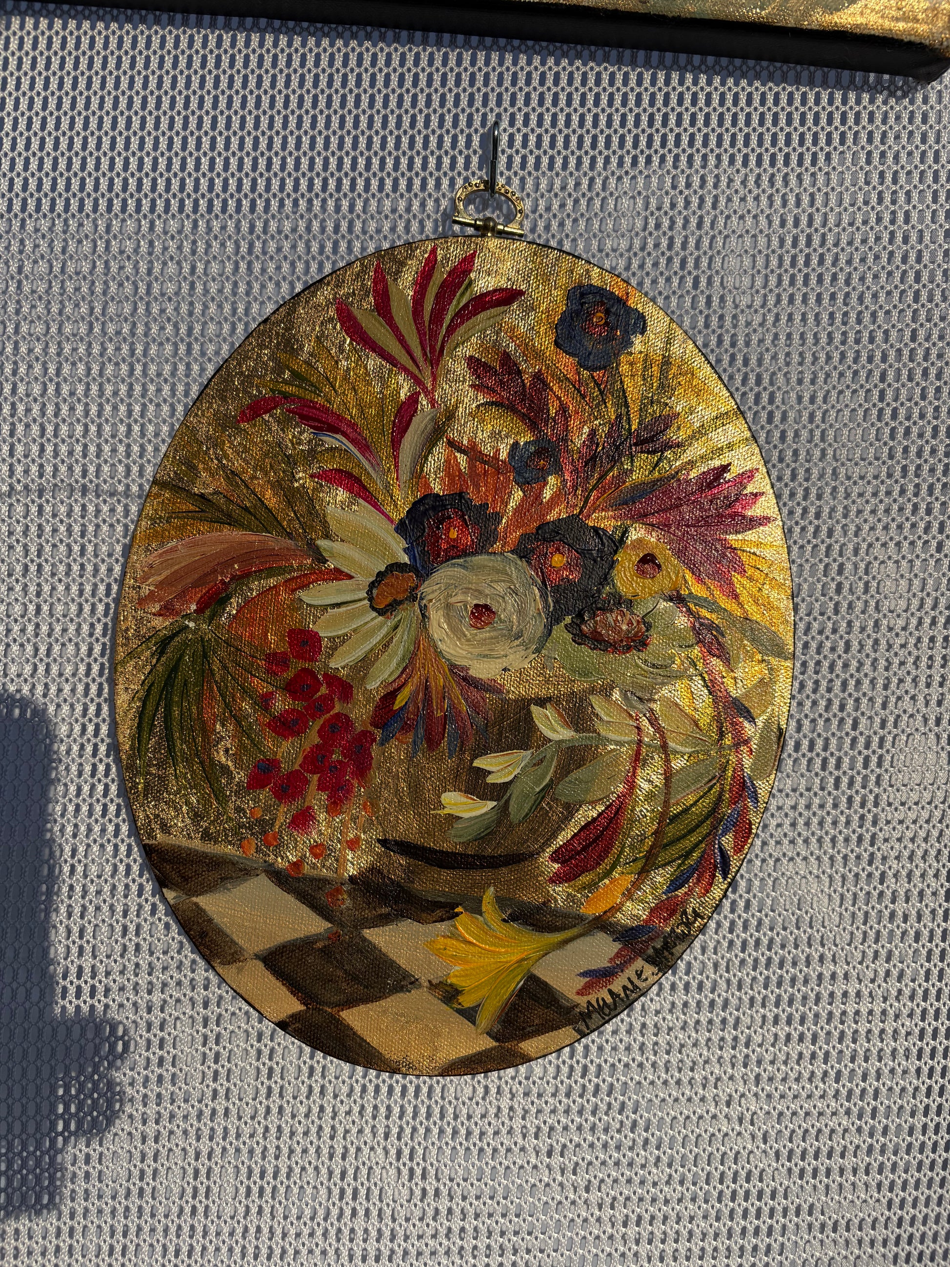 Original painting on oval canvas, about 8x10 in. Vintage hardware hook on top.