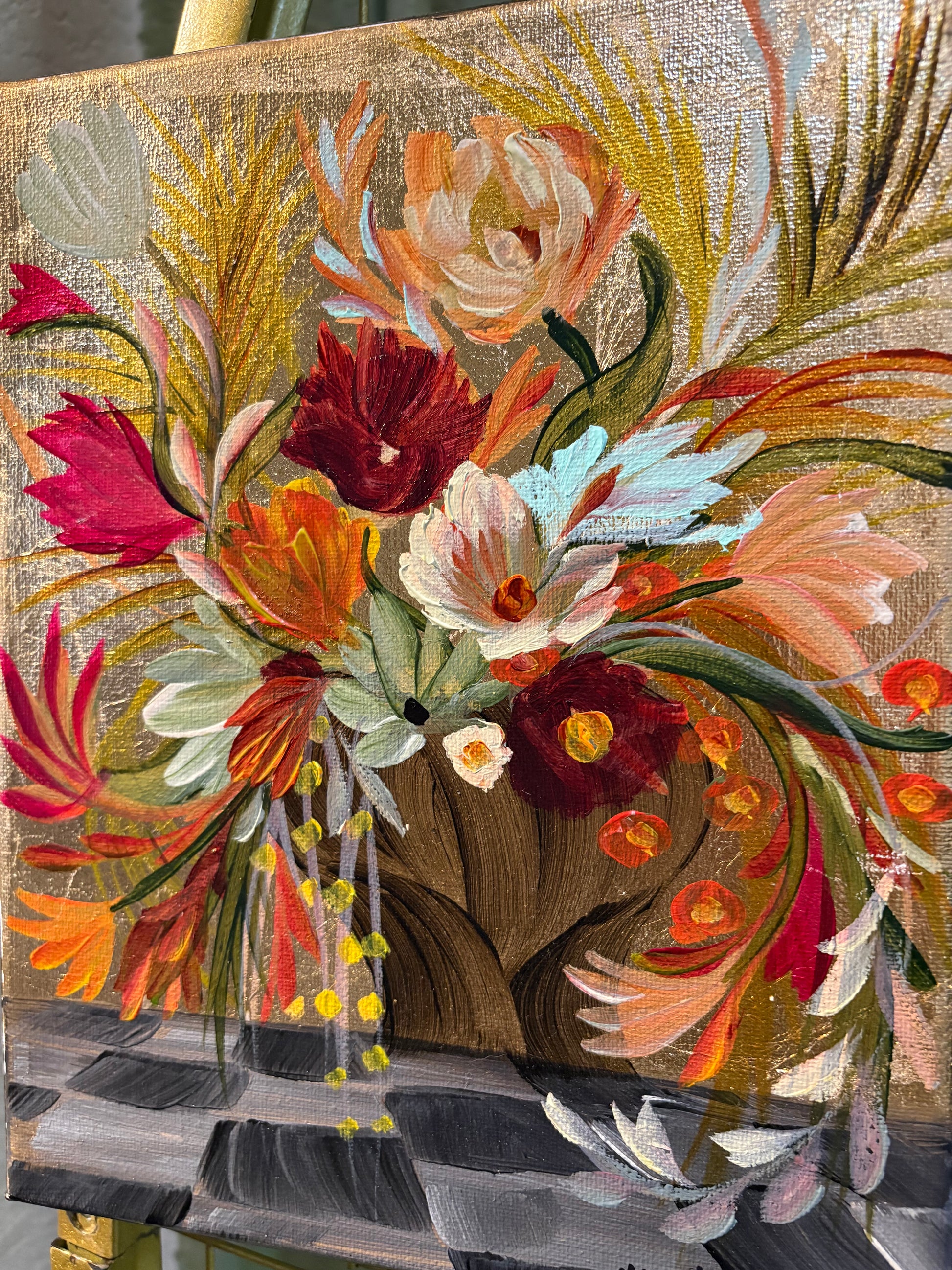 Original painting on canvas, 8x10 inches. Acrylic, gold metal leaf, glazing mediums and varnish on stretched canvas. Hanging hardware attached.